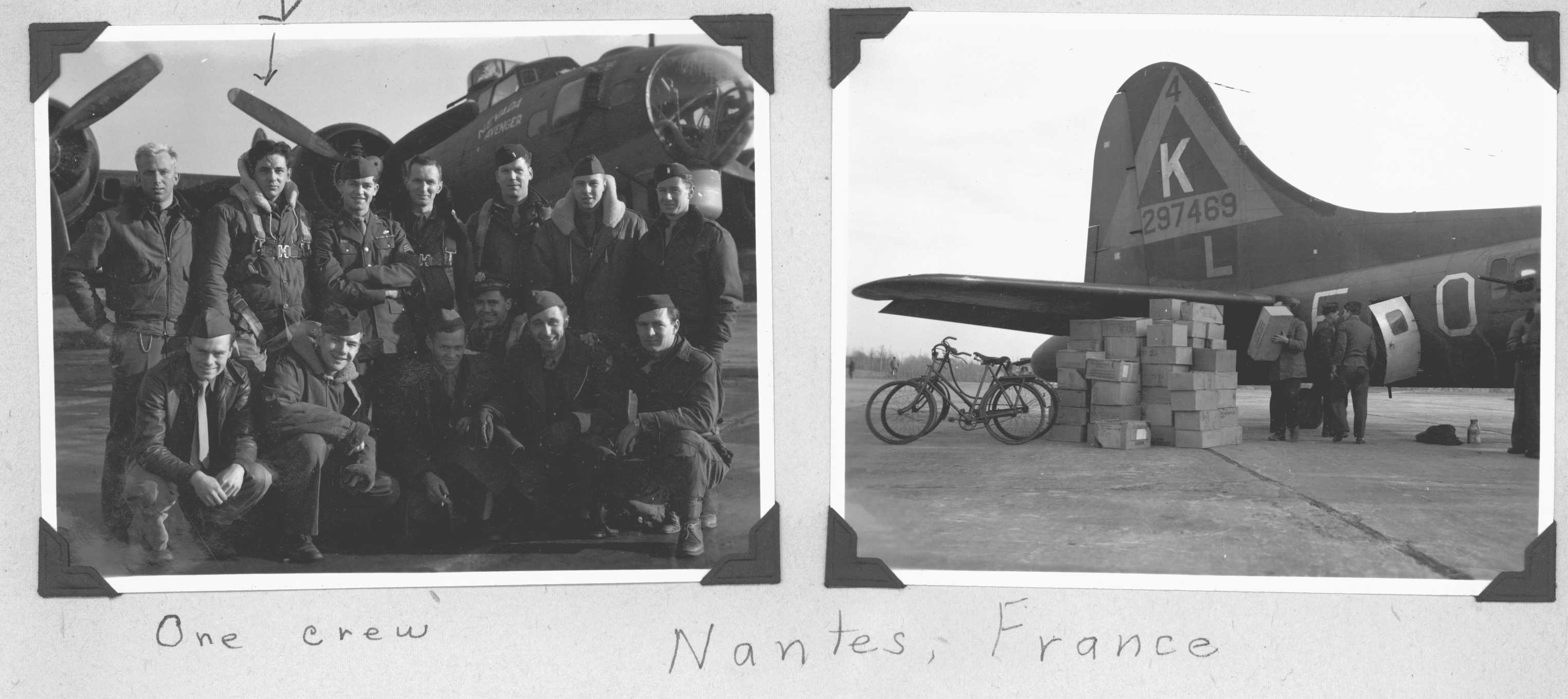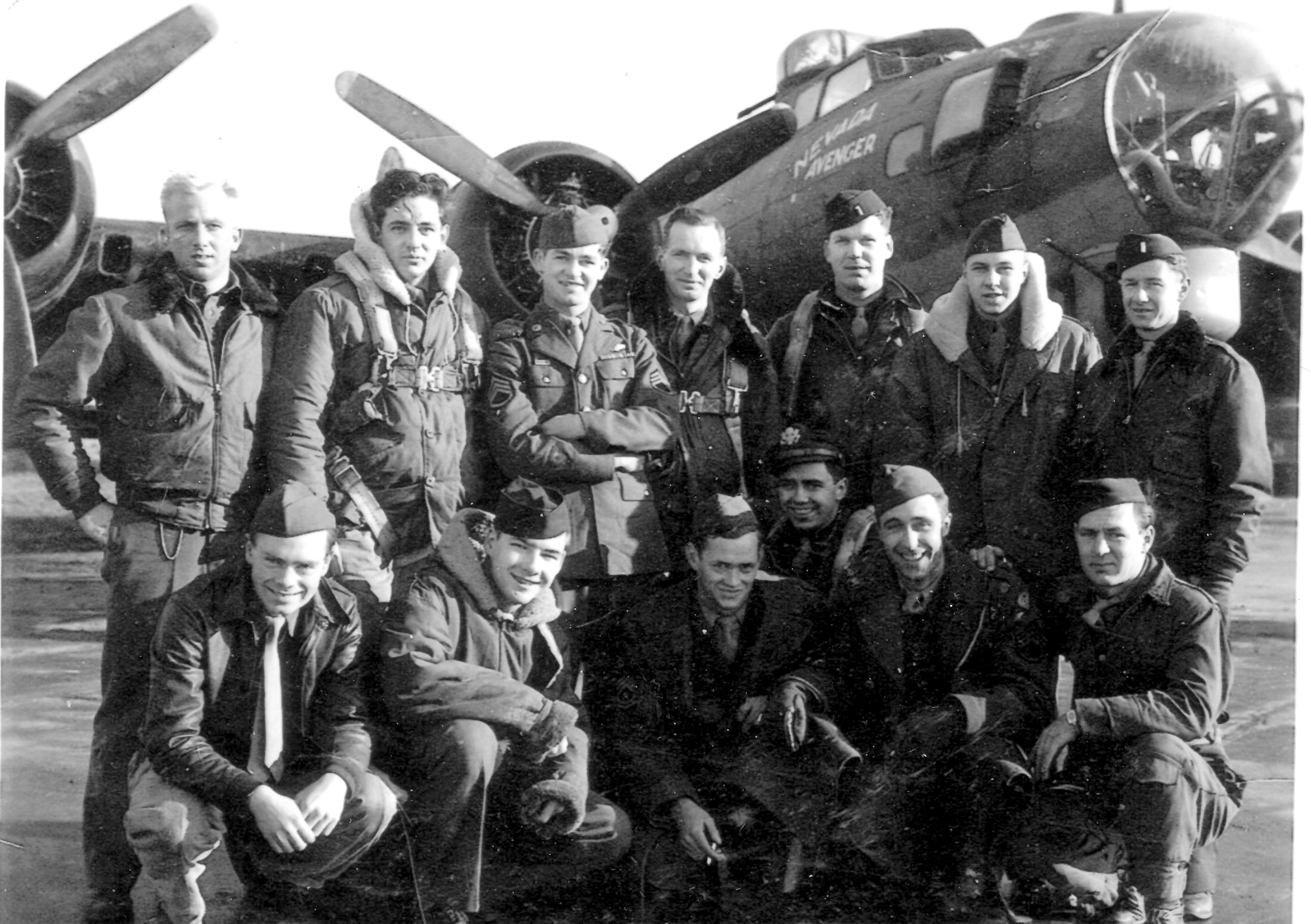 Crew of B-17G #42-38013 Nevada Avenger prior to the flight to Nantes. Pilot 2nd Lt. Robert C. Owens, back row 3rd right. Photo courtesy of www.384thbombgroup.com
