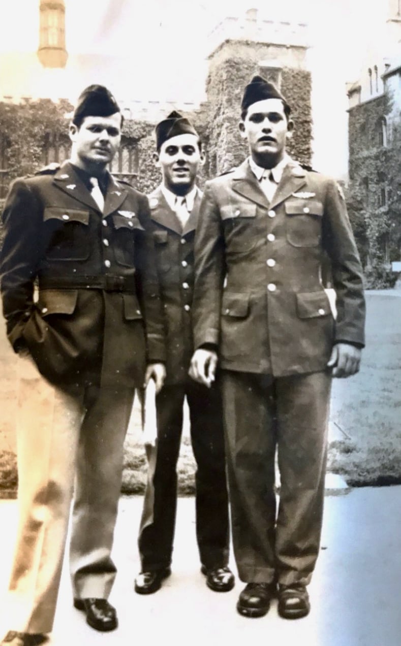 L-R S/Sgt. Henry J. Kolinek, 2nd Lt. Robert Robilotta, Sgt. L.G. Airhart. Photo courtesy of Henry J. Kolinek, Marsha Kolinek Dunevin