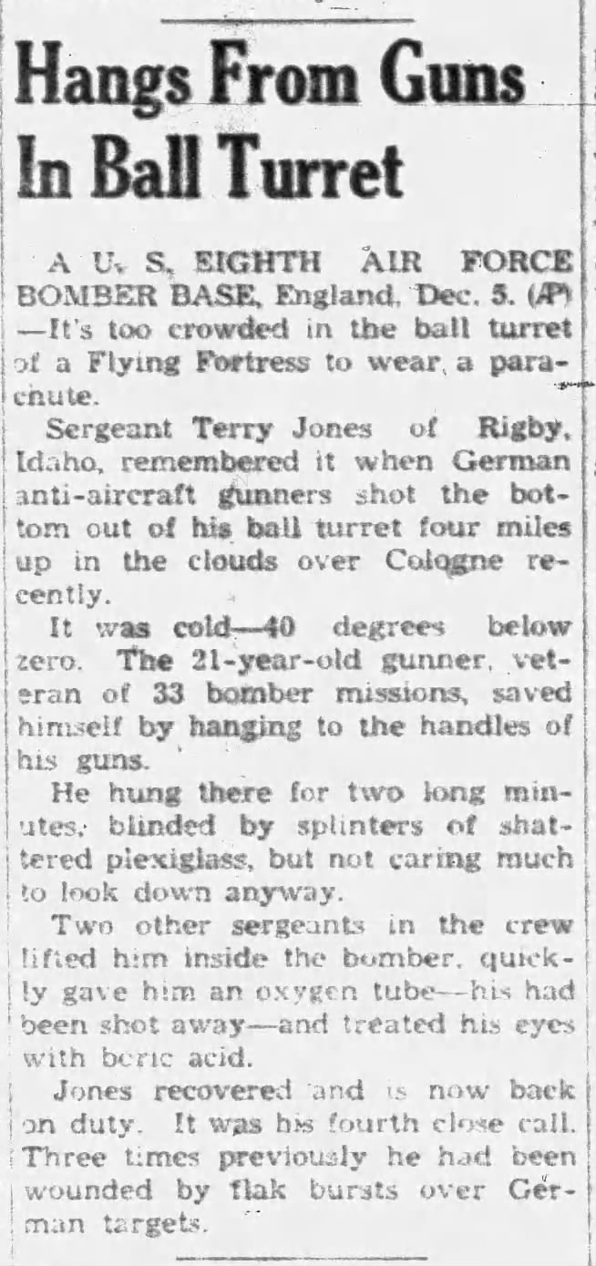 In a remarkable feat of survival, T/Sgt. Jones, without a parachute, was able to hang on to the control handles while bracing himself with his right leg in the fragments that remained of the ball turret. Within seconds, his fellow crewmates, Sgt. Earl E. Frerichs (radio operator) and Sgt. Melvin F. Weeks (waist gunner) saw what had happened, and their desperate rescue attempt began. After two harrowing minutes hanging suspended between the shattered turret and open sky, T/Sgt. Jones was safely back inside the bomber. Blue from exposure to the bitter cold, T/Sgt. Jones had been without oxygen throughout the whole ordeal, his legs were bruised, and he was also temporarily blinded by shards of plexiglass that cut his face and eyes. His crewmates swiftly led him to the radio room, administering oxygen and applying boric acid and bandages to his eyes.