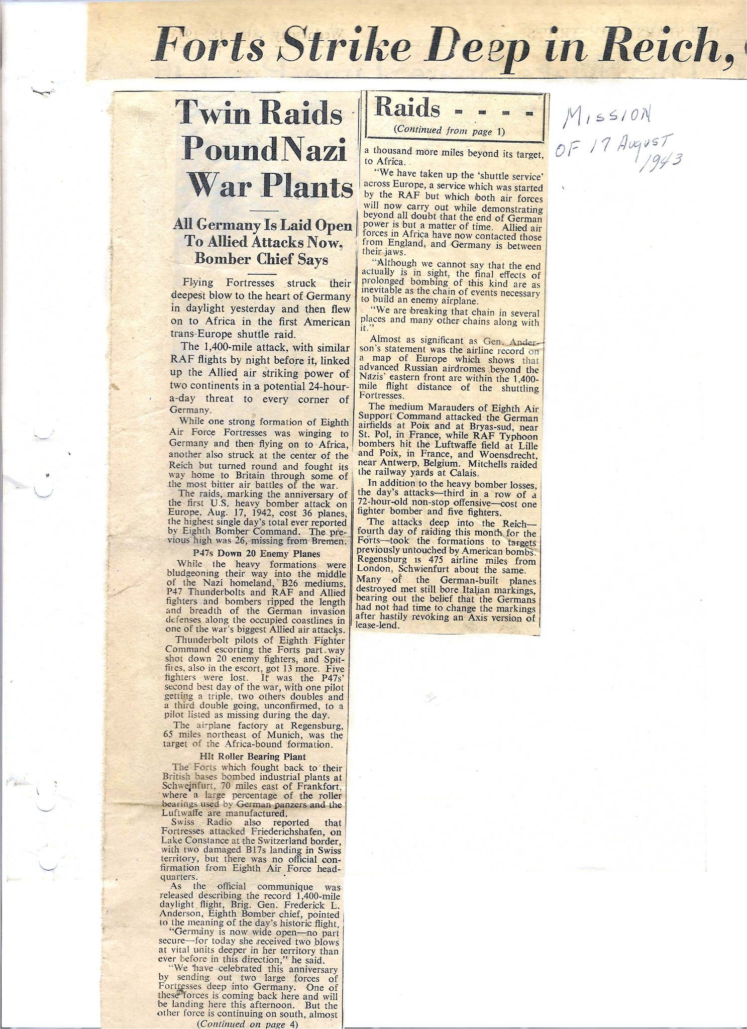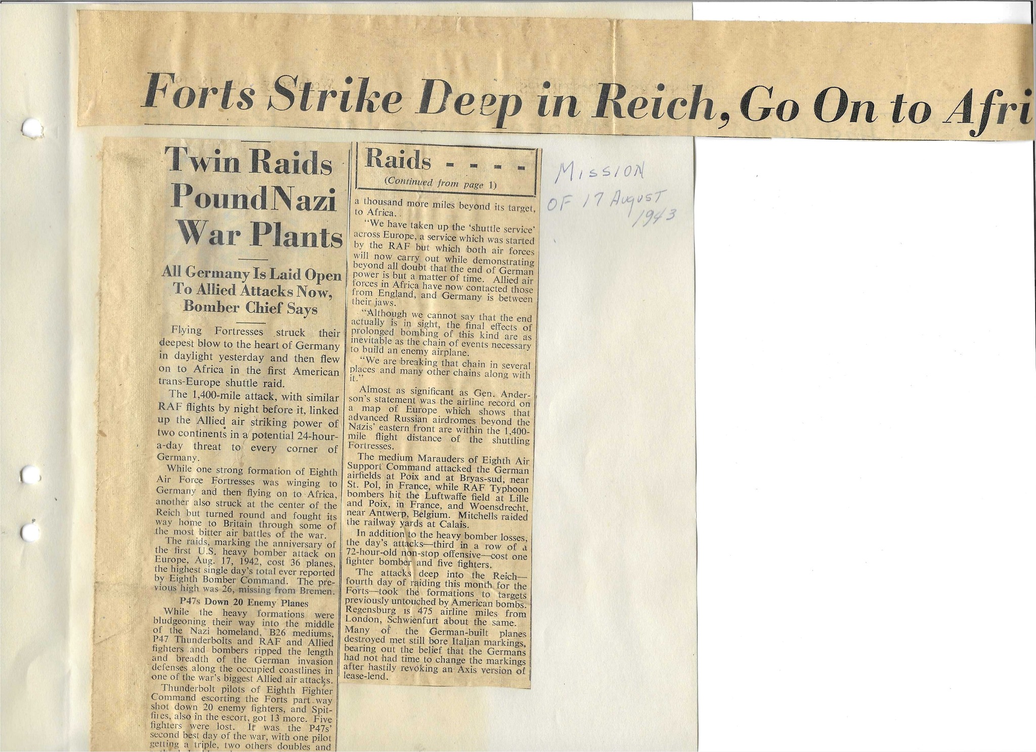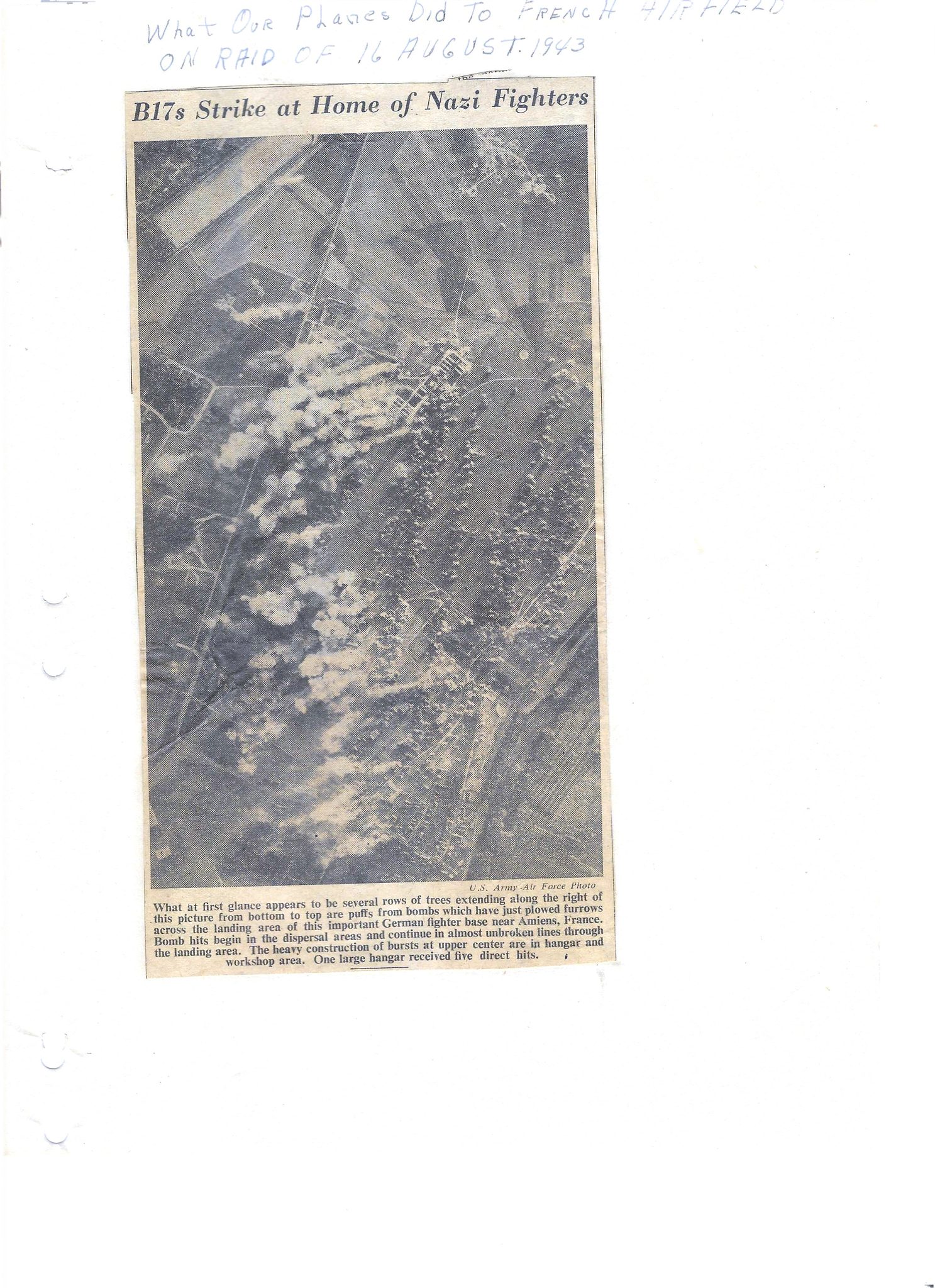 Newspaper cutting kept by S/Sgt. John W. Johnson on raids involving the 384th Bomb Group. Image courtesy of Jeff Johnson