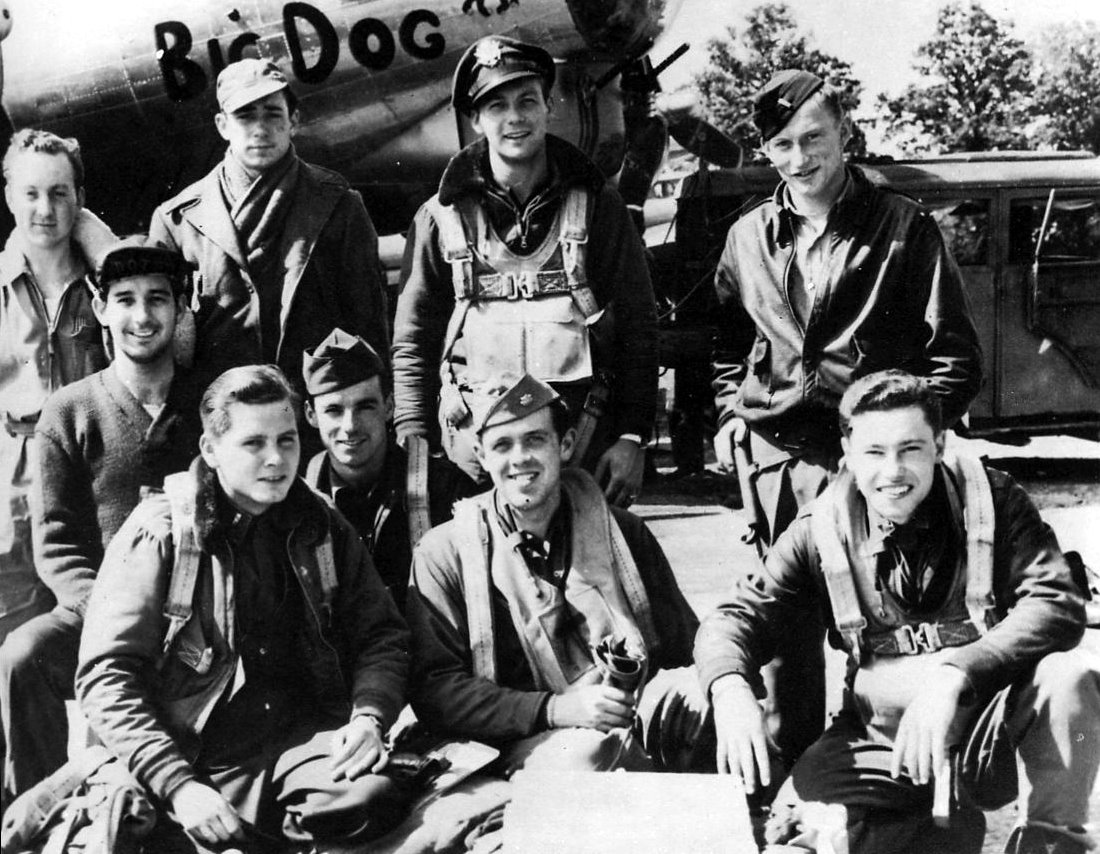Unidentified crew in front of Big Dog. Mid front row Major Gerald B. Sammons. Photo courtesy of www.384thbombgroup.com