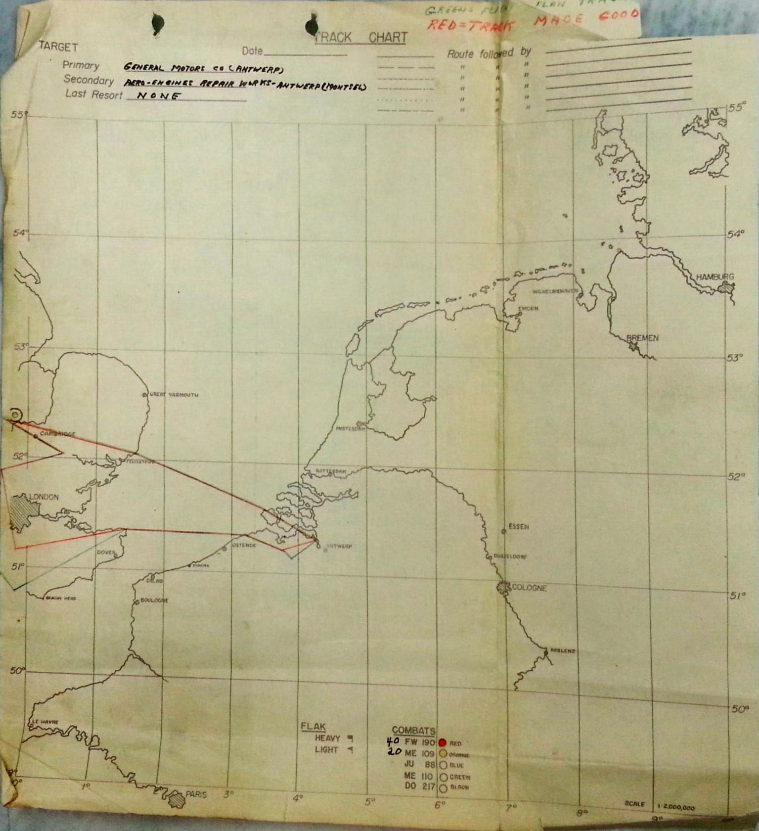 Track chart for Mission #1, the red line showing route flown. Note the record of attacking enemy fighters. Courtesy of www.384thbombgroup.com