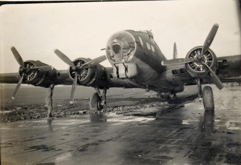 On the 17th August 1943 he was part of the crew on B-17F #42-29728 El Rauncho, taking part in the infamous Schweinfurt-Regensburg raid. This was his third combat mission, with the aircraft suffering heavy damage including a feathered engine, and damage to the undercarriage. The aircraft was able to make it back to Grafton Underwood but was severely short of fuel. The decision was made to circle the airfield to allow other aircraft to land, before the inevitable crash landing which posed the risk of blocking runways. However, a further engine died due to a lack of fuel, leaving no other option than to land immediately. A belly landing ensued, with the aircraft sliding a considerable distance before finally coming to rest very close to some parked aircraft. Although all the crew walked away with minimal injuries, the aircraft was deemed to be non-repairable, and was subsequently salvaged.