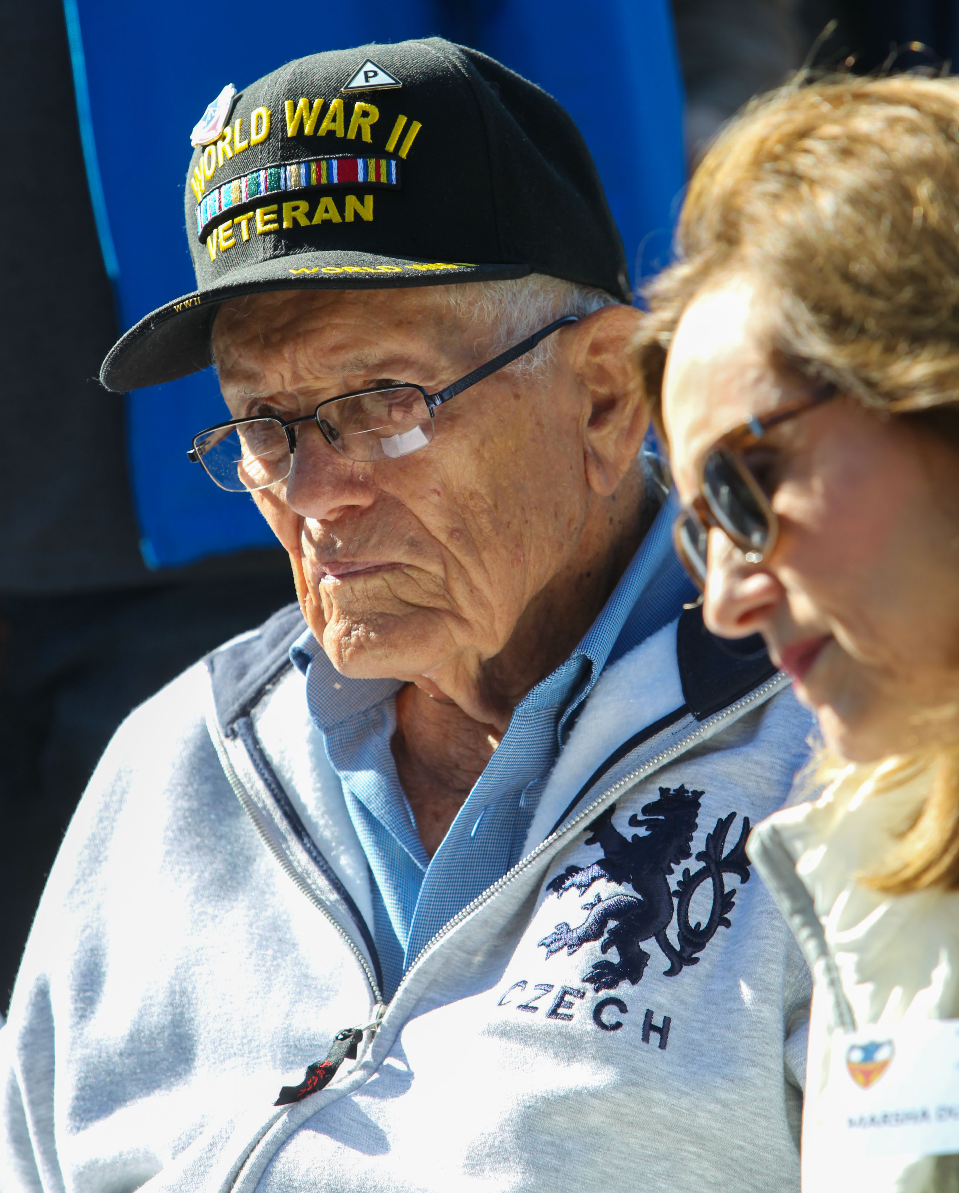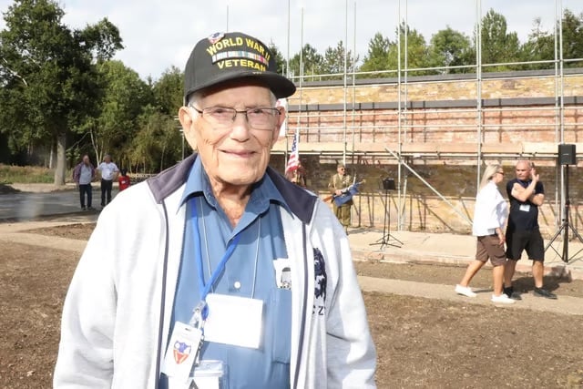 Henry J Kolinek, September 2023 Junket with daughter Marsha. Photo Kevin Lamberth and Vaughn Glynn, courtesy www.384thbombgroup.com