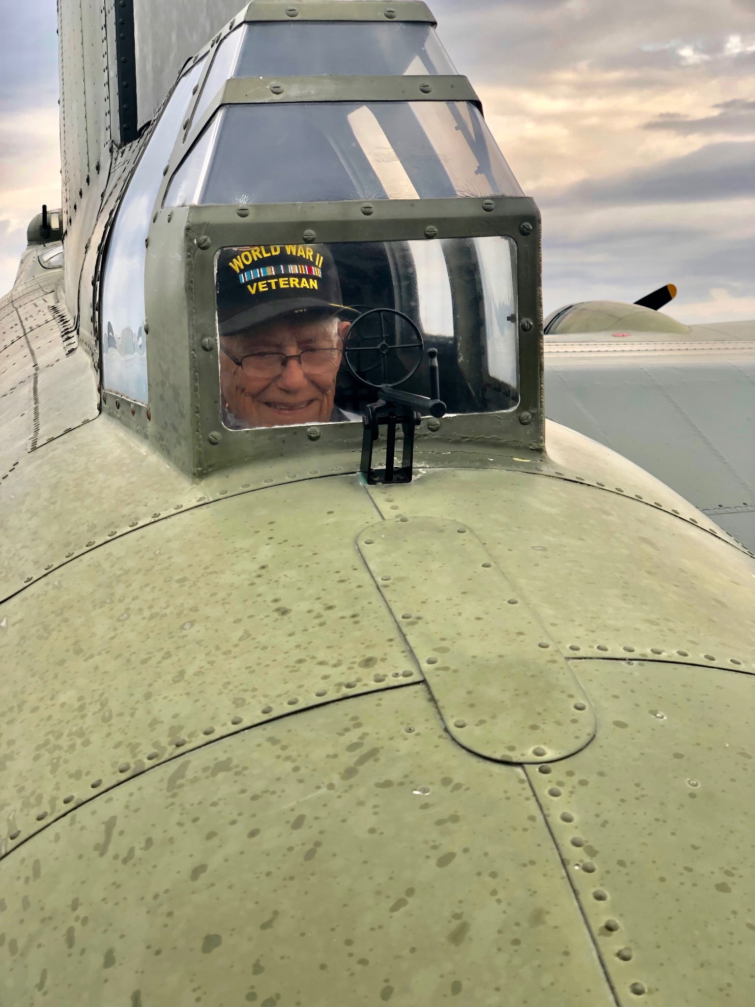 Junket XI, 22nd September 2019. Henry in his old office onboard B-17G Sally B, IWM Duxford, UK. Photo Paul Furiga, courtesy of www.384thbombgroup.com