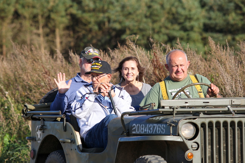September 2023 Junket on the old airfield site at Grafton Underwood - Henry sitting in the front with his daughter, Marsha, and son in law, Dennis seated behind. Photo Kevin Lamberth and Vaughn Glynn, courtesy www.384thbombgroup.com