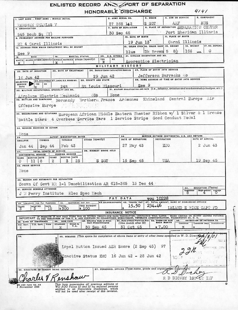 S/Sgt. Renshaw, Honorable Discharge note. Photo Dave Brown, courtesy of www.384thbombgroup.com