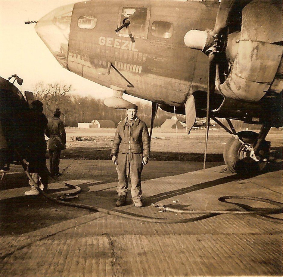 S/Sgt. Charles Renshaw with B-17F #42-5404 Geezil. Aircraft is on hardstand 12. Photo courtesy of www.384thbombgroup.com