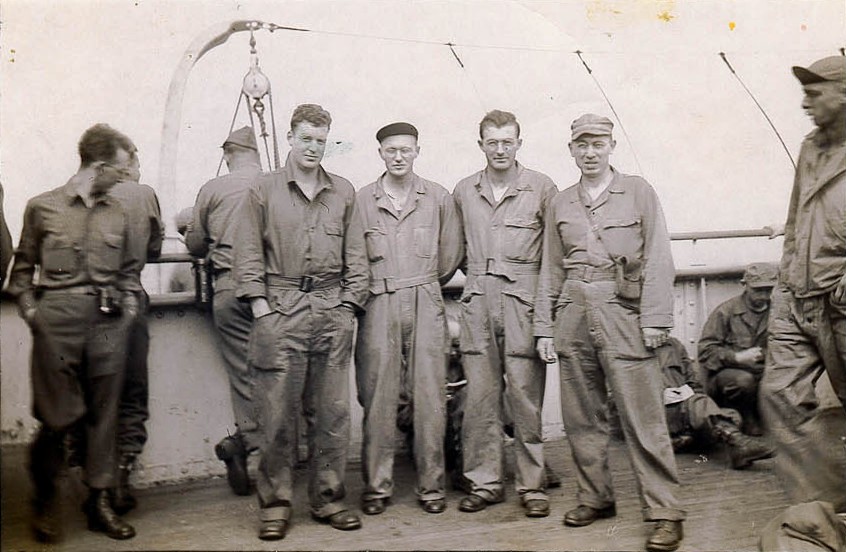 S/Sgt Charles V. Renshaw on far right of group of four. Thought to be on Queen Elizabeth, May 1943. Photo Dave Brown, courtesy of www.384thbombgroup.com