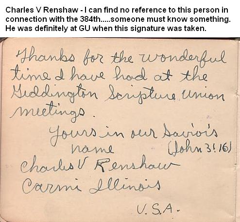 At Geddington, he was a regular visitor to the Scripture Union Meetings at Geddington Chapel, and also a regular visitor after service to a local family, the Brown's, including 9 year old Peter Brown. At the end of the war, before the 384th was relocated to Istres in France, the village of Geddington held a farewell party for the 384th personnel whom they had forged close ties with over the past couple of years. Peter was to attend, taking with him an autograph book of which S/Sgt. Renshaw was to sign.