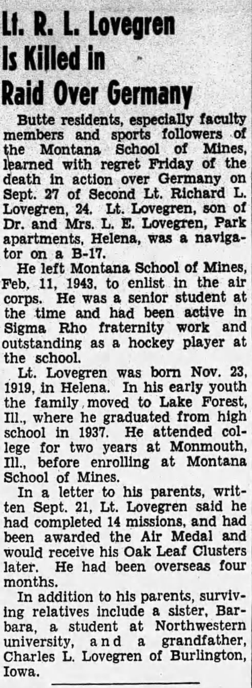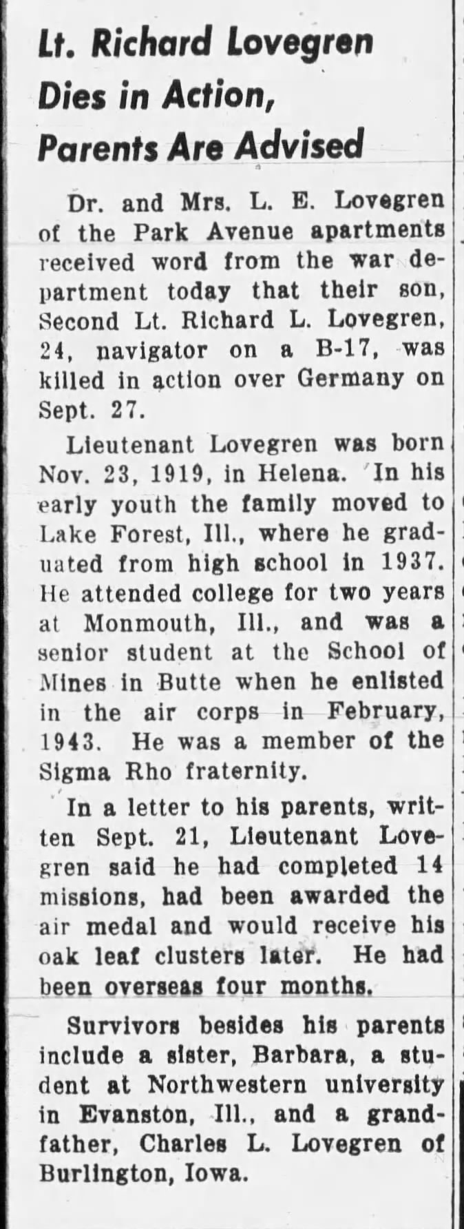 Leroy Richard Lovegren was born 23rd November 1919 in Helena, Montana to Dr. Leroy Eldron Lovegren and Grayce Constance Ryan Lovegren. He also had a sister named Barbara.