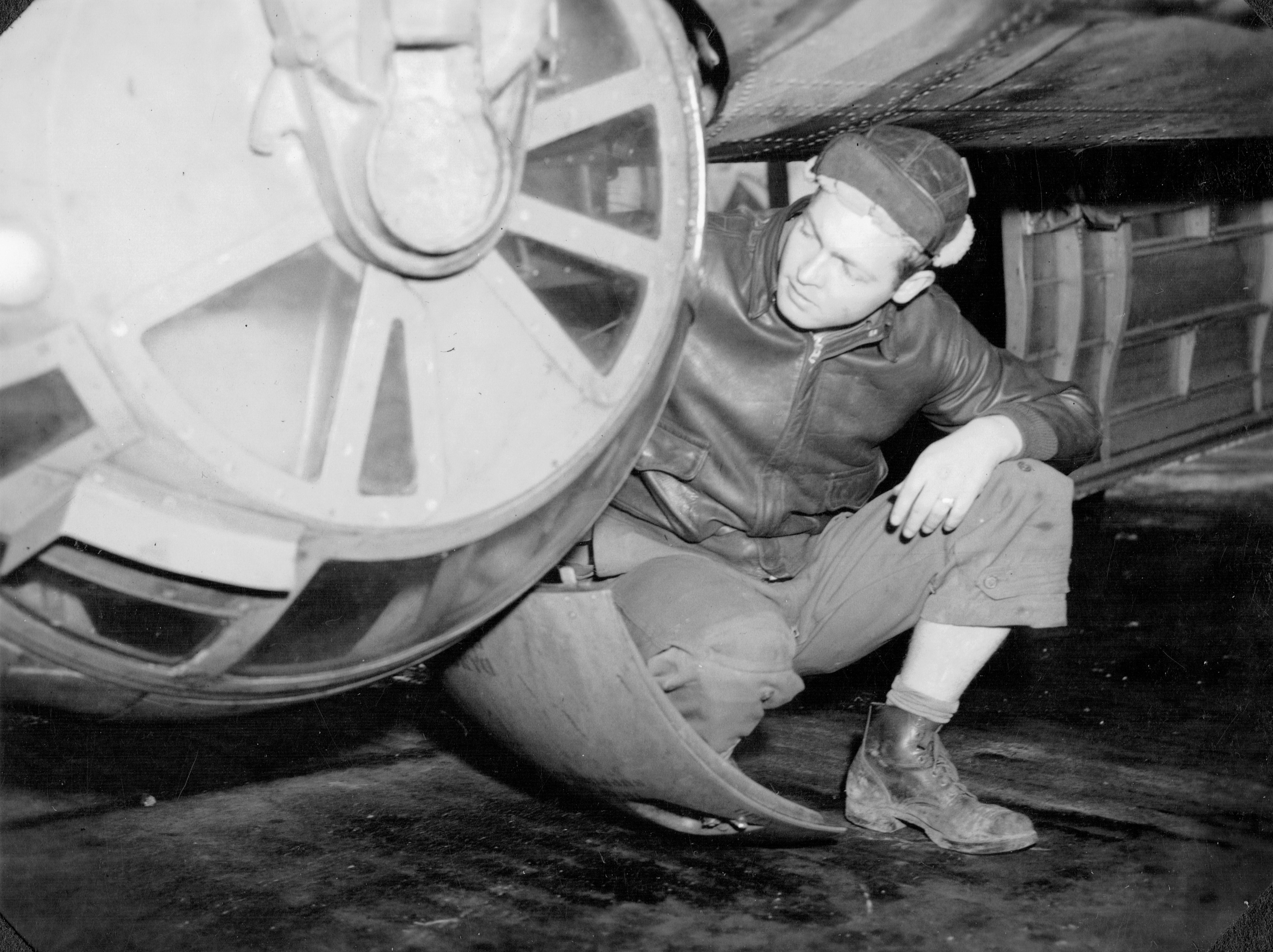 T/Sgt. Terry Lee Jones at his usual workstation, the ball turret of a B-17. Photo Andy Rivera courtesy of www.384thbombgroup.com