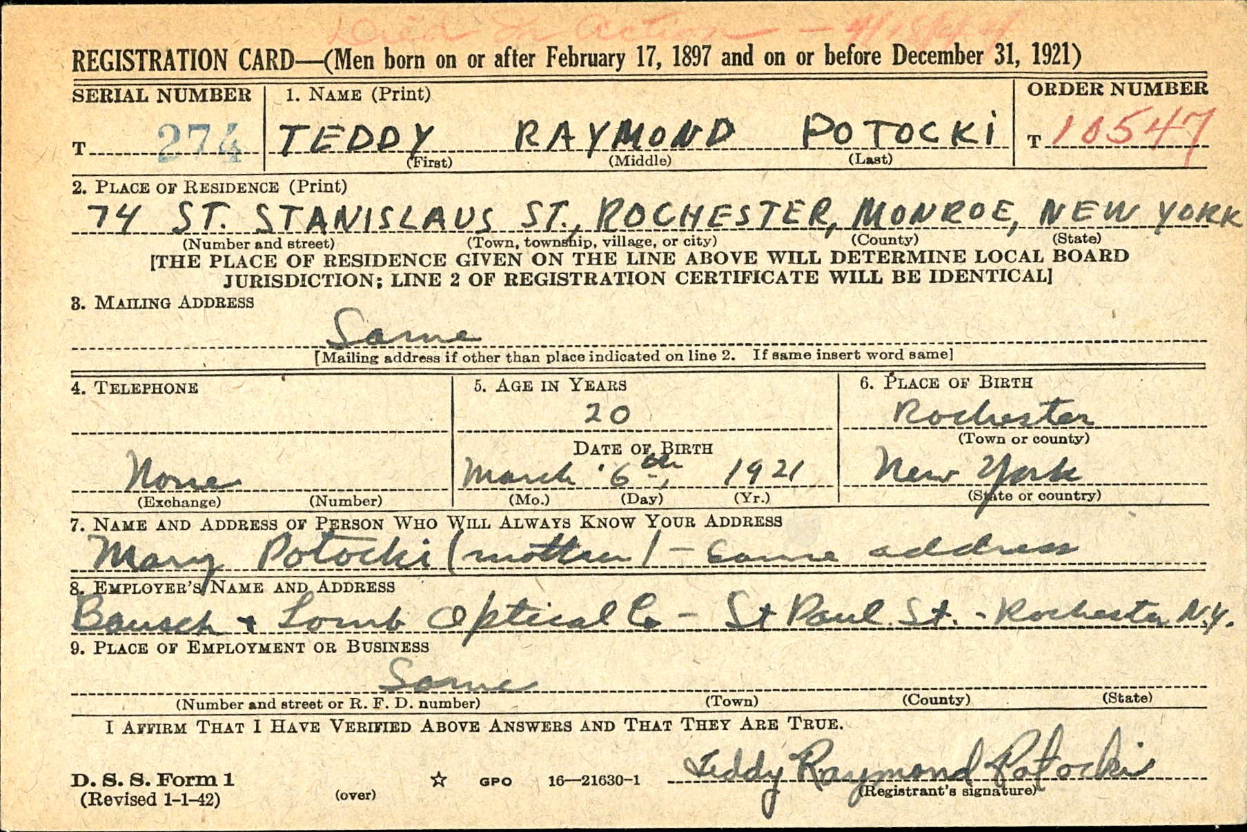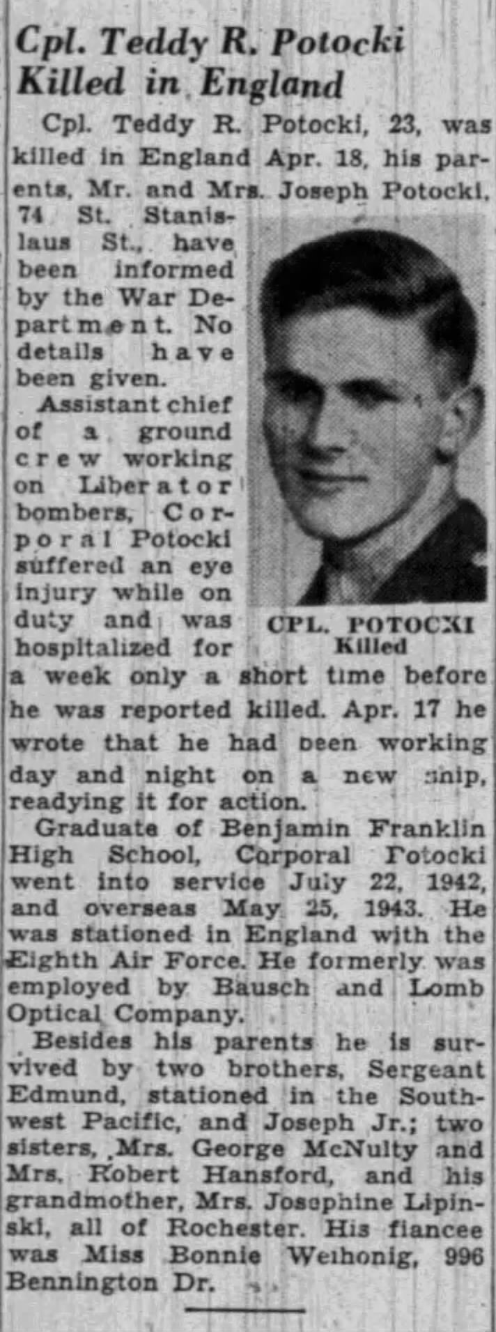 Teddy Raymond Potocki was born on 6th March 1921, in Rochester, Monroe County, New York. His parents were Joseph and Mary (nee Lipinski) Potocki. Teddy had two brothers, Edmund and Joseph Jnr., two sisters and was engaged to Miss Bonnie Wethonig.