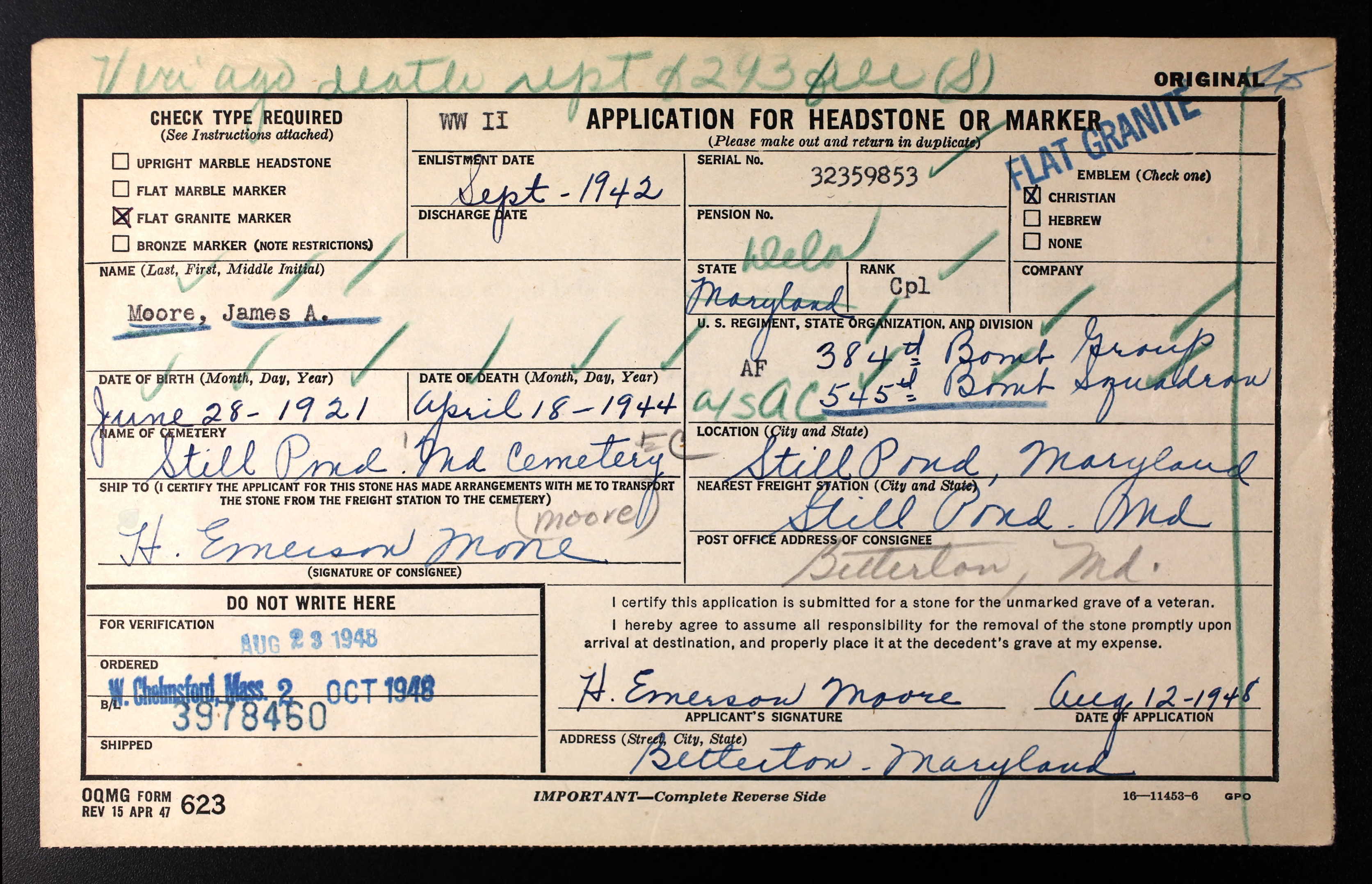 James Arthur Moore was born on 28th June 1921, in Betterton, Kent County, Maryland. His father, Carlton Casper Moore, was to die in 1937. His mother, Gertrude Evelyn Emerson, died in September 1944. He had one brother, Herbert Emerson Moore, who was to serve in the U.S. Army. James attended the Chesterton High School in Maryland before being recorded as a store keeper in 1940, and then working for the Dupont Nylon Company in 1941, prior to enlisting.