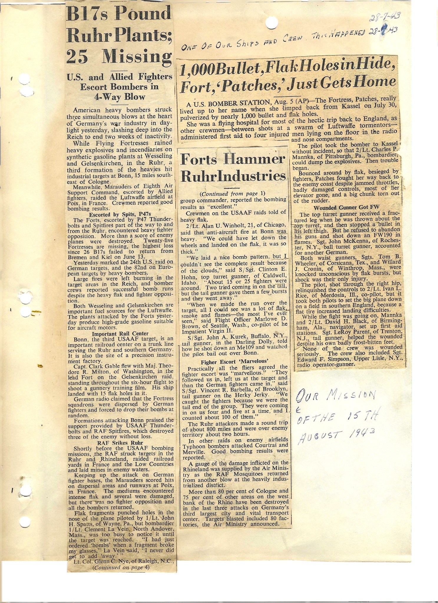 Newspaper cuttings detailing missions involving the 384th Bomb Group. Note story on B-17 #42-5848 "Patches" from the 384th. Image courtesy of Jeff Johnson
