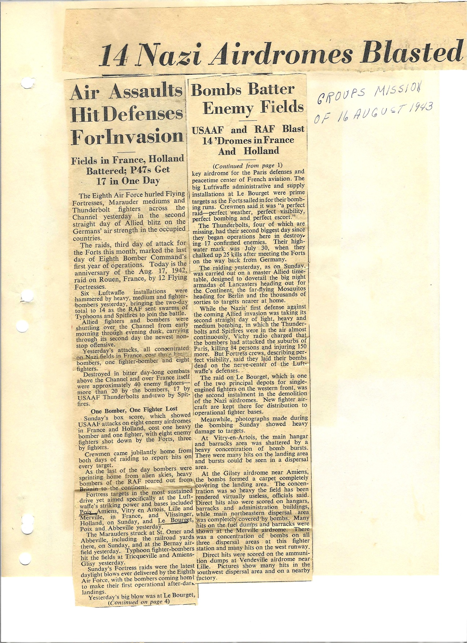 Newspaper cutting kept by S/Sgt. John W. Johnson on raids involving the 384th Bomb Group. Image courtesy of Jeff Johnson